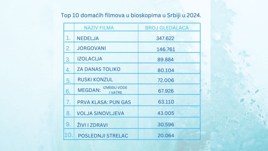 Najgledaniji film u srpskim bioskopima u 2024. godini je domaći film „Nedelja“ reditelja i člana UFUS AFA Nemanje Ćeranića, koji je videlo 347.622 gledalaca.