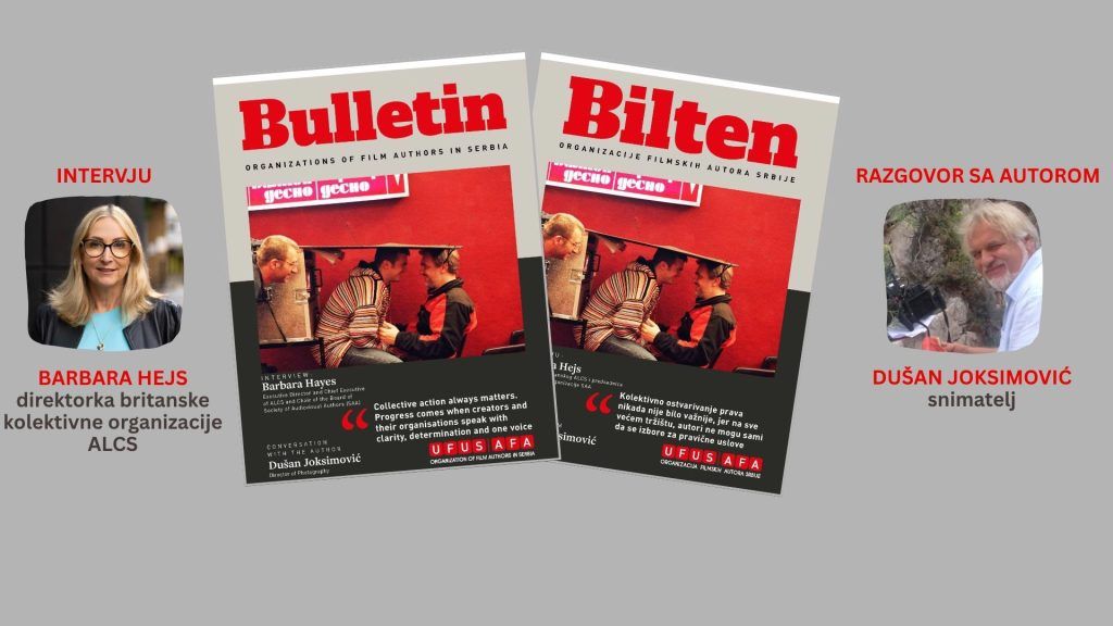 UFUS AFA je objavila aprilski broj Biltena u srpskoj i engleskoj verziji koji je dostupan na sajtu organizacije. INTERVJU Barbara Hejs, direktorka britanske kolektivne organizacije ALCS i predsednica Upravnog odbora evropske organizacije Society of Audiovisual Authors “Kolektivno ostvarivanje prava nikada nije bilo važnije, jer na sve većem tržištu, autori ne mogu sami da se […]